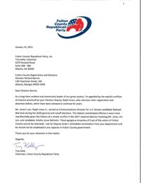 In a Jan. 15 letter to Richard Barron, the department’s director, Trey Kelly, the party’s chair, stated Ralph Jones Sr., the department’s registration chief, should be fired because his son, Ralph Jones Jr., worked on the 2020 election campaign for U.S. Sen. Raphael Warnock, a Democrat.